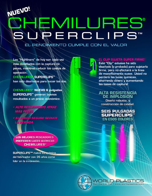 >New Chemilures® Six Inch Superclips™Our same strong performance at an economical price. Chemilures® 6 Inch Superclips™ have a unique new clip proven to hold tight, are easy to attach or remove, yet will never nick soft monofilament line. Most important, this new Lightstick (engineered with the help of highliner captains) is designed & proven to NOT fall off in the water. Size: 11mm Dia. x 6" Packed: 50 per Foil Bag, 1,000/box, per color. Available in these colors: GREEN BLUE WHITE PINK